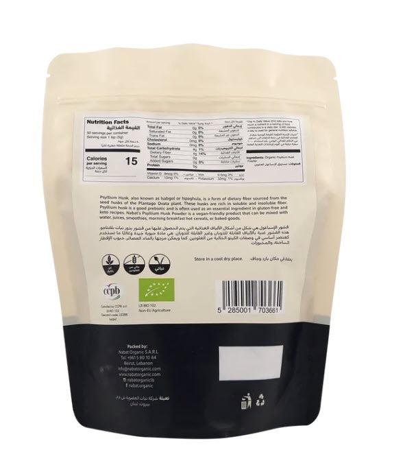 قشور السيليوم، المعروفة أيضًا باسم إيزابغول أو إسباغولا، هي نوع من الألياف الغذائية تُستخرج من قشور بذور نبات بلانتاجو أوفاتا. هذه القشور غنية بالألياف القابلة للذوبان وغير القابلة للذوبان. تُعد قشور السيليوم مادة بريبيوتيك جيدة، وغالبًا ما تُستخدم كمكون أساسي في وصفات الكيتو والخالية من الغلوتين. مسحوق قشور السيليوم من نابات هو منتج نباتي يُمكن مزجه مع الماء، والعصائر، والسموذي، وحبوب الإفطار الساخنة، أو المخبوزات.