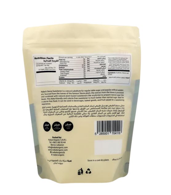 Nabat’s Stevia Sweetener is a natural substitute for regular table sugar and popular artificial sweeteners. Sourced from the leaves of the famous Stevia plant, the extract from the leaves is processed and combined with organic plant-based sweeteners like erythritol to prepare natural sugar-like beads. This Keto-friendly and calorie-free sweetener is much better than normal sugar. Ideal for a calorie-free food, it can be used in beverages, baked goods, and fruit salads for a sweetening experience.